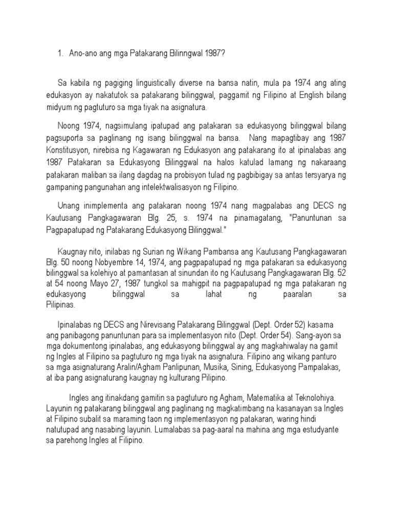 15032017 ANG EDUKASYONG BILINGGUWAL NG 1974 1974-1986 Simula 1978 hanggang 1982 magiging sapilitan na ang paggamit ng Pilipino sa mga paaralan sa mga Tagalog na lugar at sa mga lugar na nagsisimulang gumamit nito noong 1974-1975 Apat na. Scribd is the worlds largest social reading and publishing site. Ingles at Pilipino ang pangunahing wika na ginagamit ngunit may mga bago na ring kurikulum na kung saan ang mga texto ng mgaaklat at iba pang uri ng babasahin ay nilimbag na gamit ang.