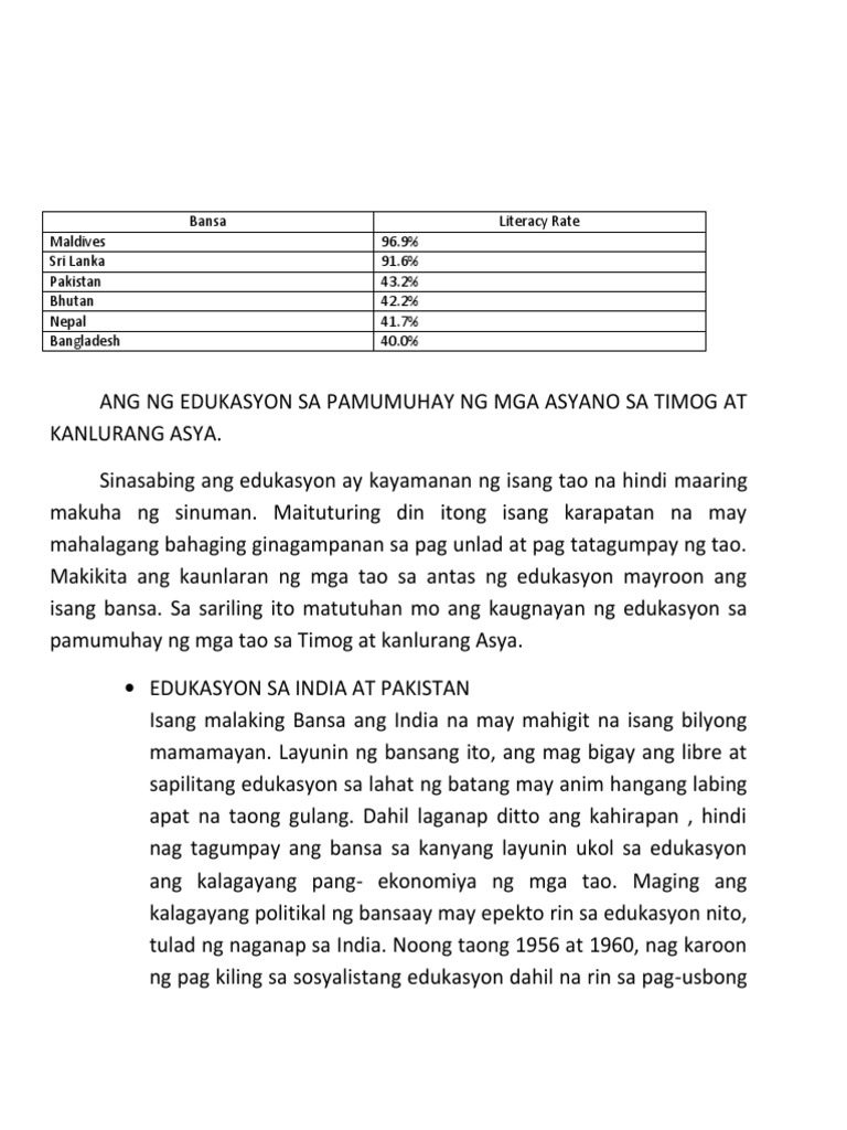 Ang pagkakaroon ng Afghanistan ng 26Bhutan ng 555 at Nepal 56 na tala ng literacy rate ay nagpapatunay na suliranin ang edukasyon sa rehiyong itoSuliranin ng kahirapanang nadudulot ng. Magbigay ng halimbawa sa rehiyon ng Timog at Kanlurang Asya na sumasalamin sa epekto ng kolonyalismo at imperyalismo ng. 1 ARALING PANLIPUNAN II Effective Alternative Secondary Education MODYUL 13 Edukasyon sa Asya BUREAU OF SECONDARY EDUCATION Department of Education DepEd Complex Meralco Avenue Pasig City INSERT PICTURE.